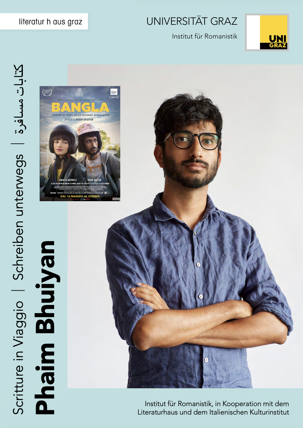 Am 24. März 2026 werden von 17.00 bis 19.00 die Studentinnen und Studenten des Instituts für Romanistik den Film Bangla. Die Liebe in Zeiten der zweiten Generationen im Literaturhaus Graz vorstellen. Es handelt sich um einen mehrfach ausgezeichneten italienischen Film aus dem Jahr 2019 von Phaim Bhuiyan, enfant prodige des zeitgenössischen italienischen Films, der nicht nur für die Regie verantwortlich zeichnet, sondern auch das Script verfasst hat, selbst mitspielt und bei der Vorführung anwesend sein wird.